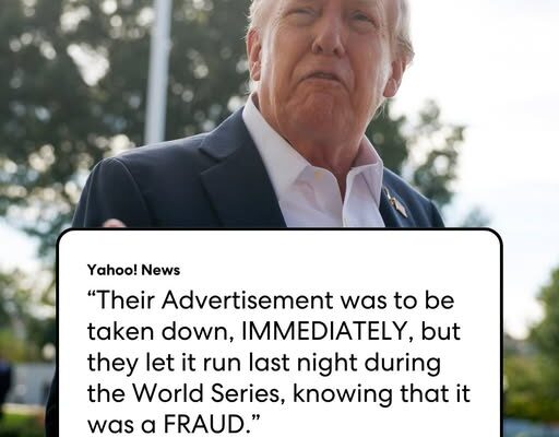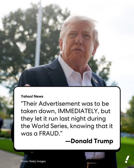 “Their Advertisement was to be taken down, IMMEDIATELY, but they let it run last night during the World Series, knowing that it was a FRAUD,” Trump said in a post on his Truth Social platform as he flew aboard Air Force One to Malaysia.