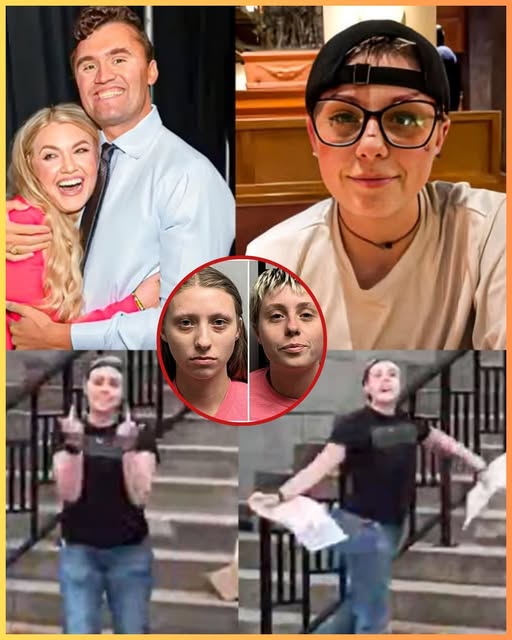 Kerri, 23, flashes the camera two middle fingers while her sister Kaylee Rollo, 22, looks on while they vandalize a Charlie Kirk memorial at the Benton County Courthouse in Arkansas.